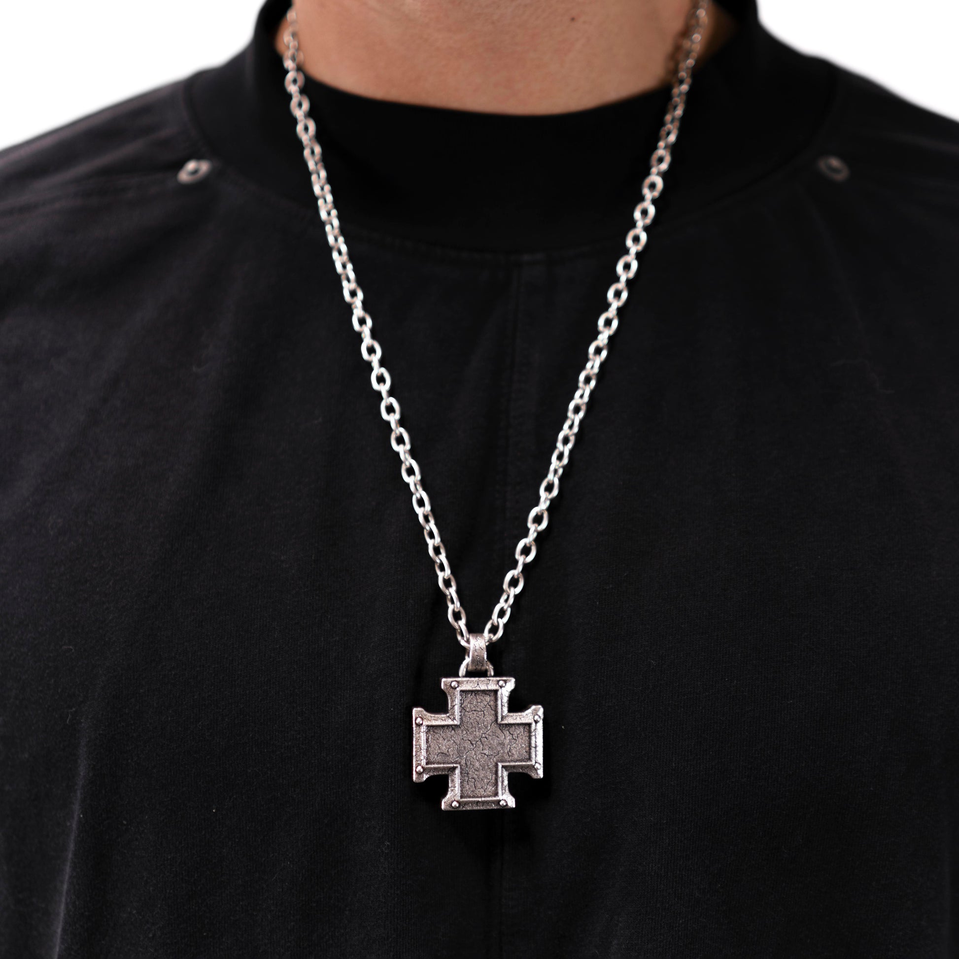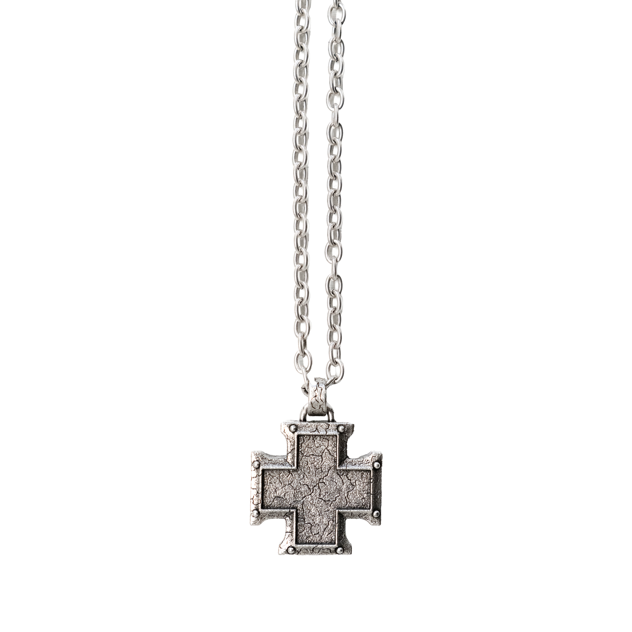 The Bastion Necklace embodies the language of protection and permanence, drawing from medieval armor forms and architectural symmetry. Cast in solid brass or sterling silver, the pendant’s fractured surface and beveled cross silhouette recall the patina of timeworn fortifications — shaped to feel unearthed rather than newly made. Subtle irregularities across the frame and riveted corners emphasize weight and tactility. Each pendant bears engraved maker’s marks and a hand-applied antique finish that deepens along the recessed edges.