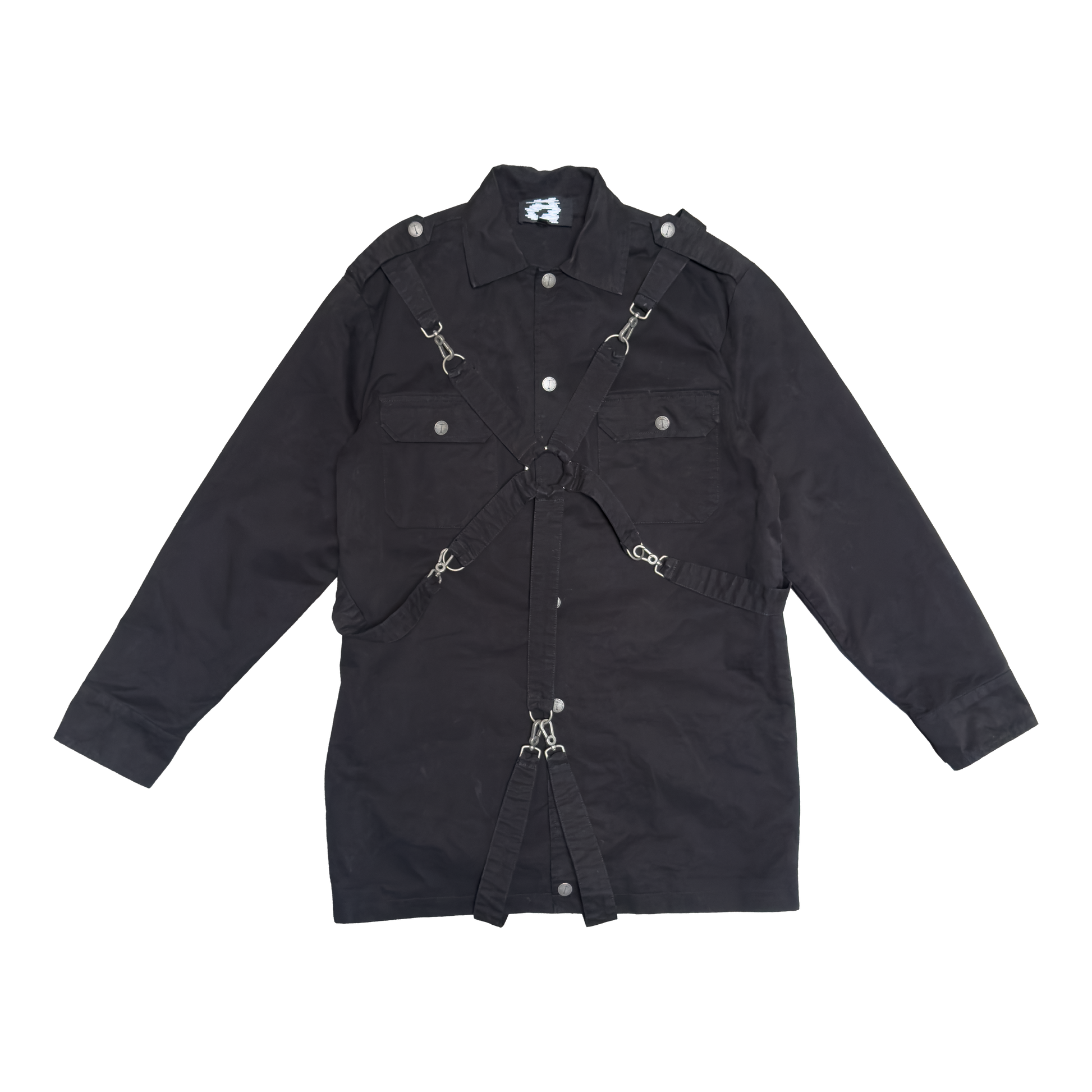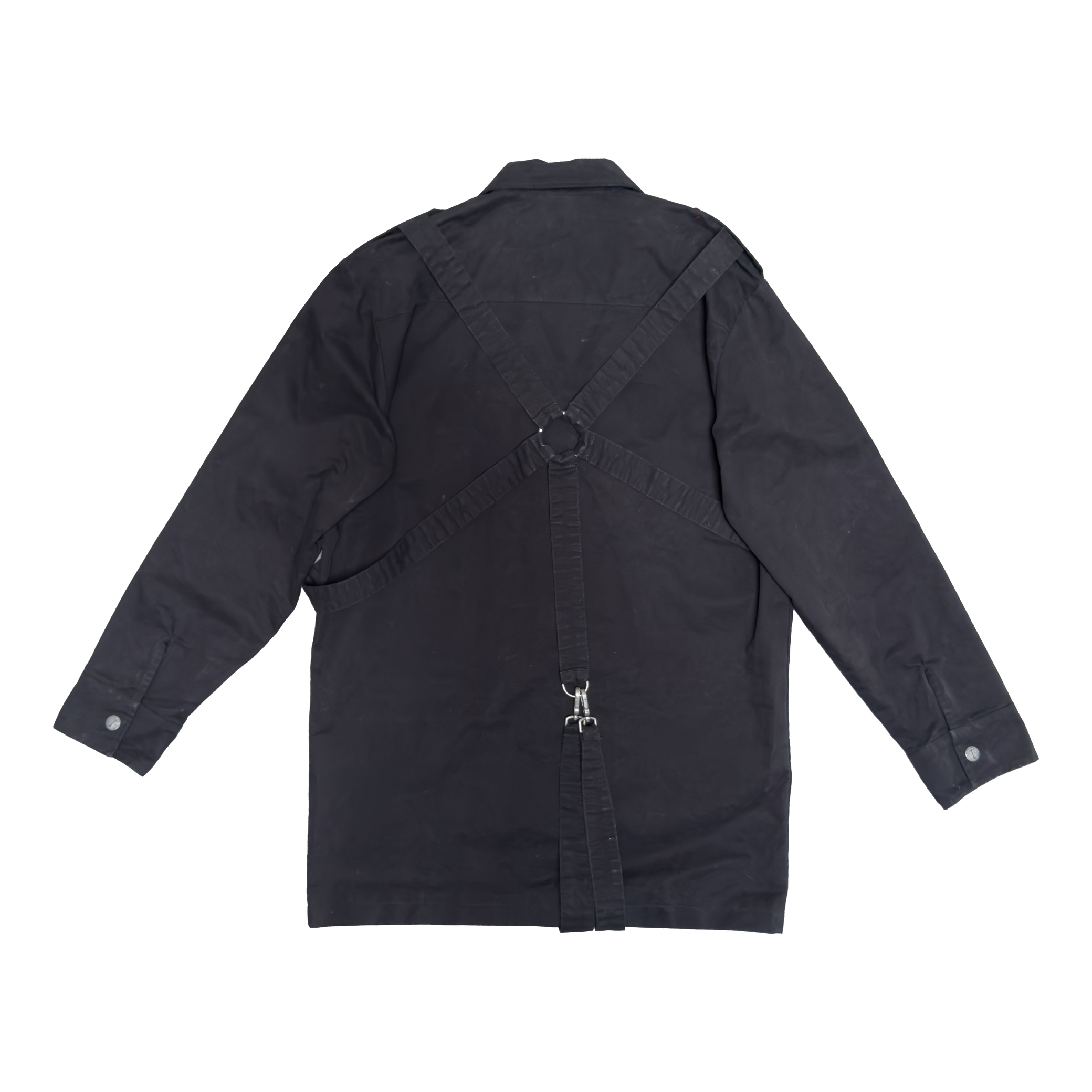 First sample of the Bondage Coat we did a while ago. Linen tag, engraved cross explosion button and rivets, pouch pockets, strap system with shoulder strap holders.