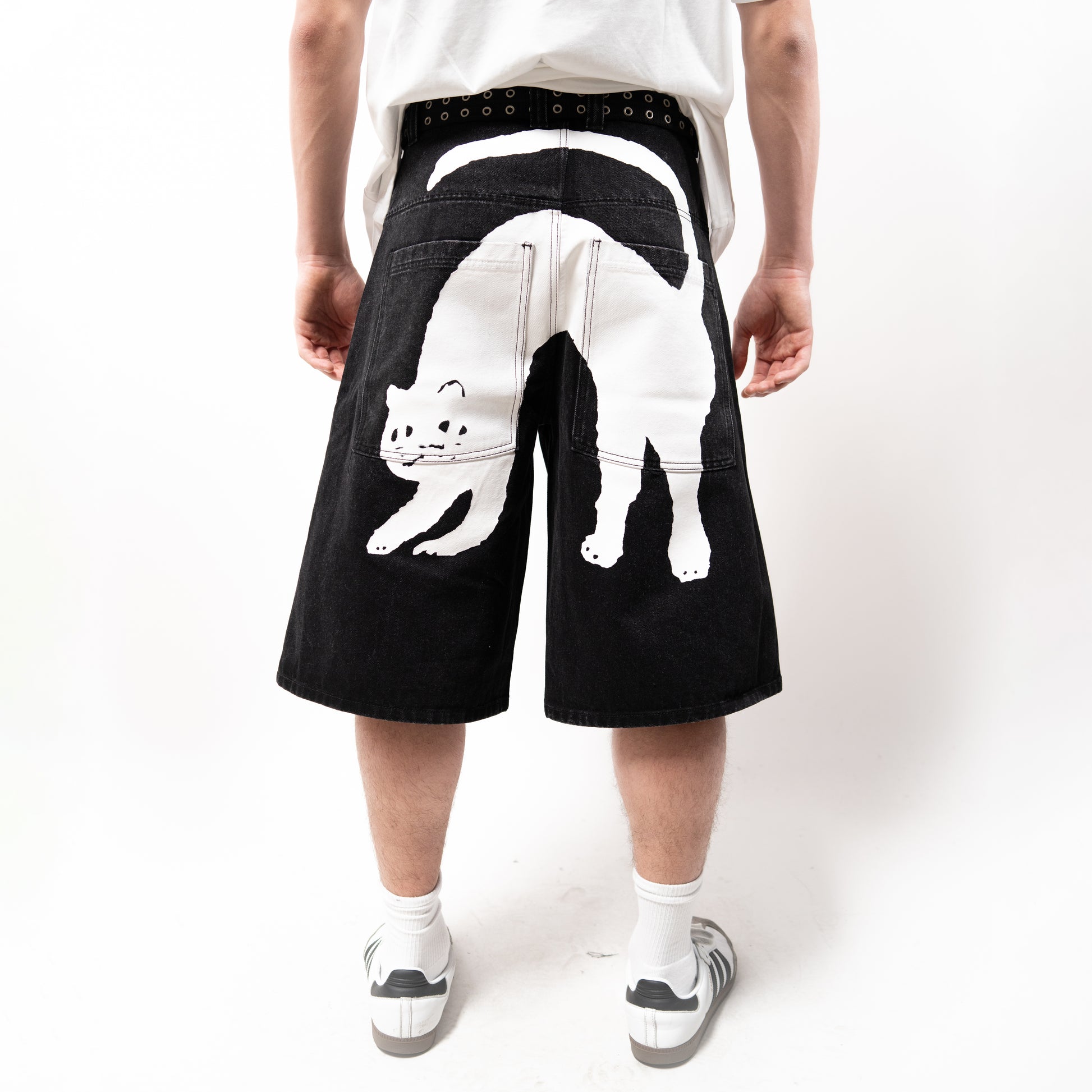 This variant of the Catvisu series comes as a pair of JNCO inspired jean shorts. These are 14oz heavyweight cotton twill with a screenprinted cat pattern, slight washing, a riveted leather patch, logo-lined pockets, YKK zipper, industrial buttons and rivets, and oversized back pockets. These sit about 2" below the knee. The cat is silkscreen printed before sewing, preventing the ink from building up at the seams.
