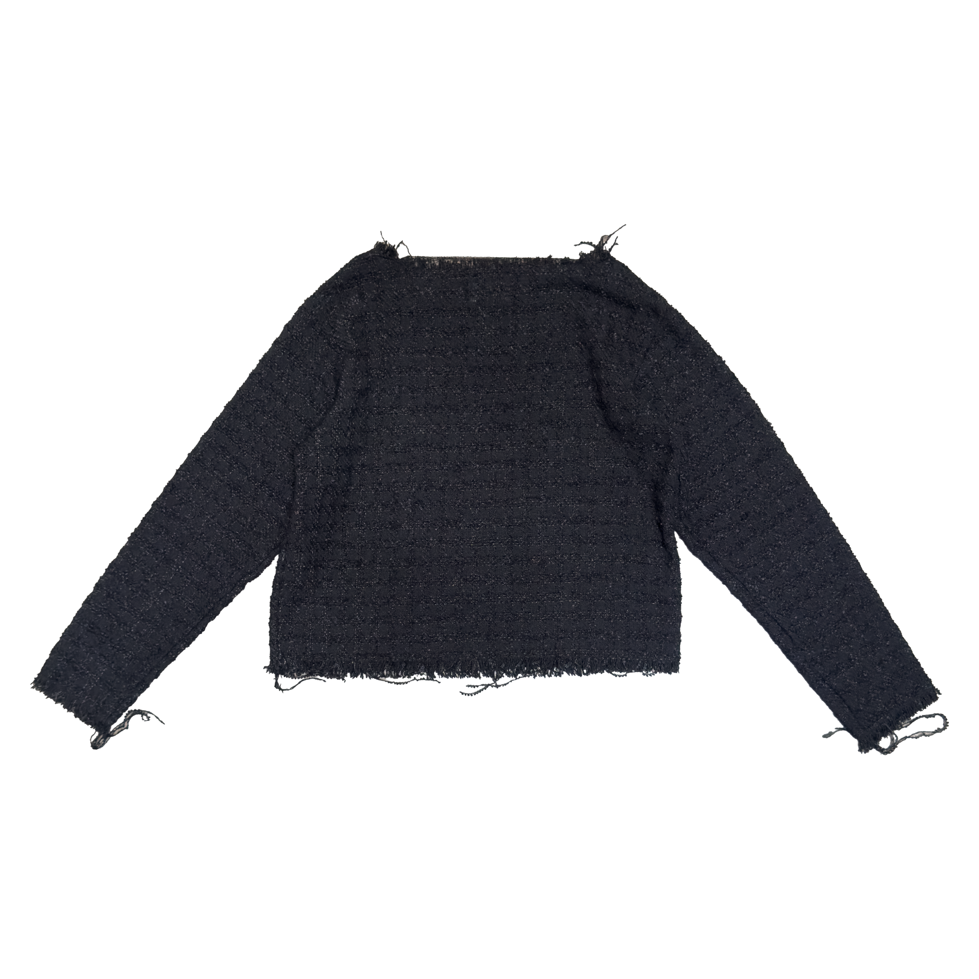 Unreleased jacquard sweater. Raw hems all around with distress, wide neck opening.