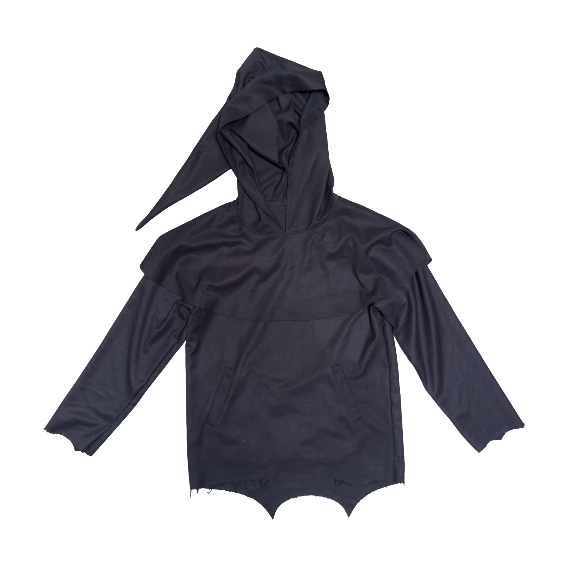 Sort've medieval. Raw hem and sleeve openings, elongated drop hood, front pouch pocket.
