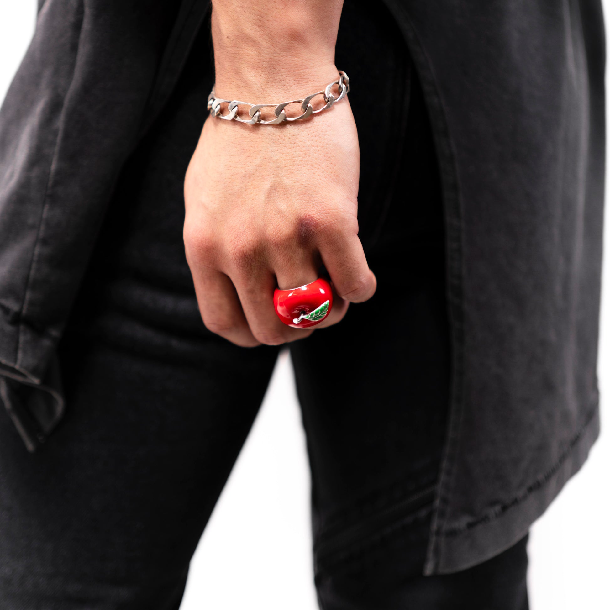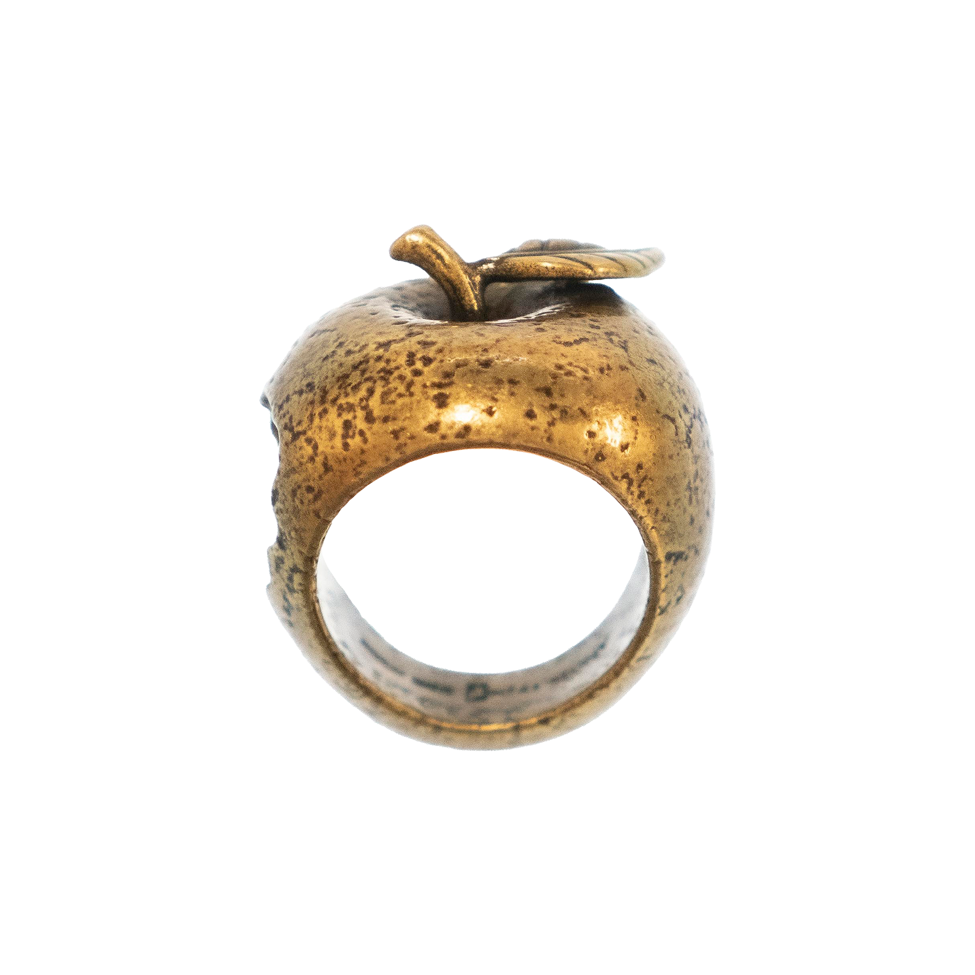 The Malus Ring reinterprets the form of a bitten crab apple — a symbol of imperfection and restraint drawn from the Malus genus of trees. Cast in solid sterling silver, raw brass, or hand-enameled brass, the ring’s surface carries the weight of oxidation and texture, mimicking the irregular skin of fruit left to weather. Its sculpted bite exposes a smooth interior, creating a contrast between erosion and form.