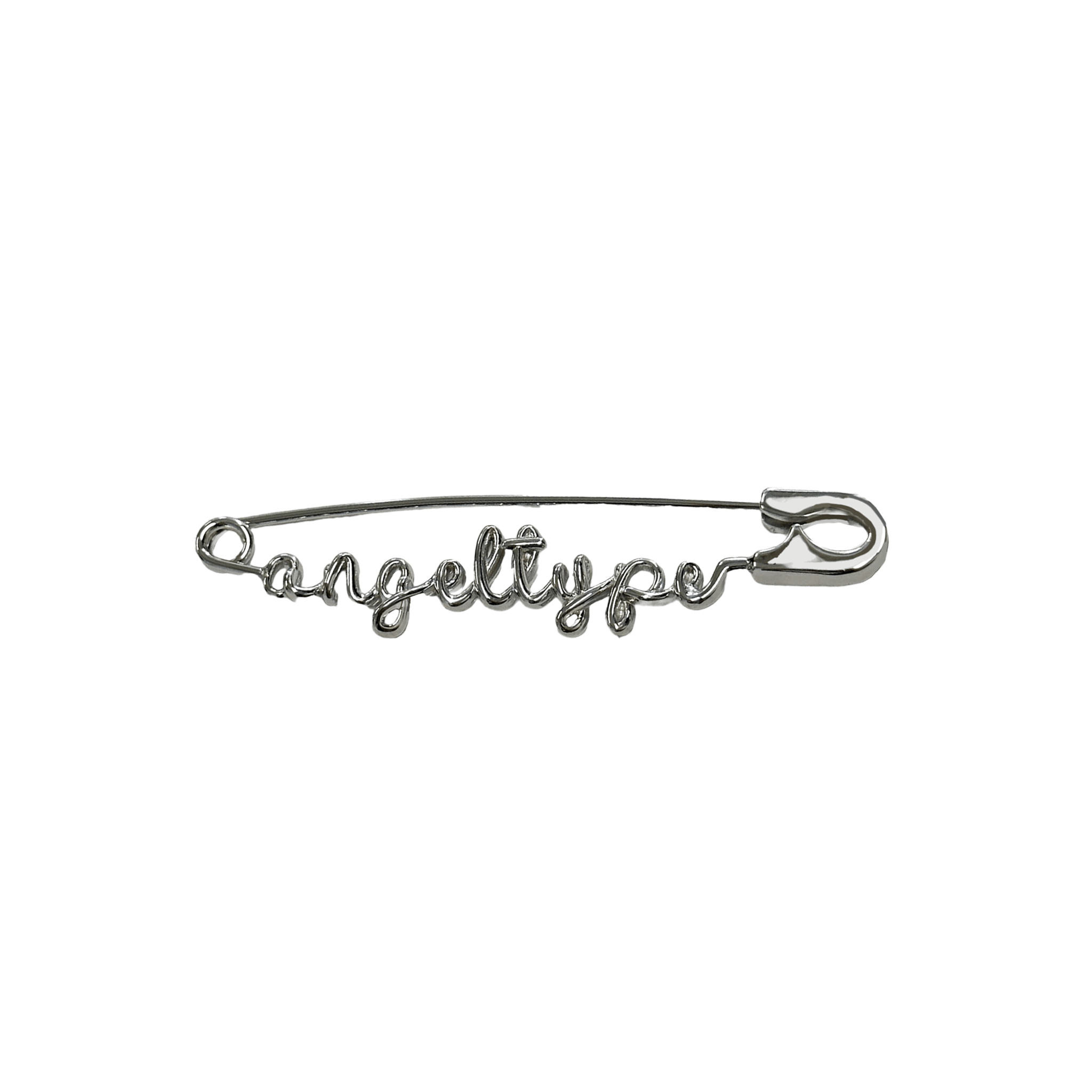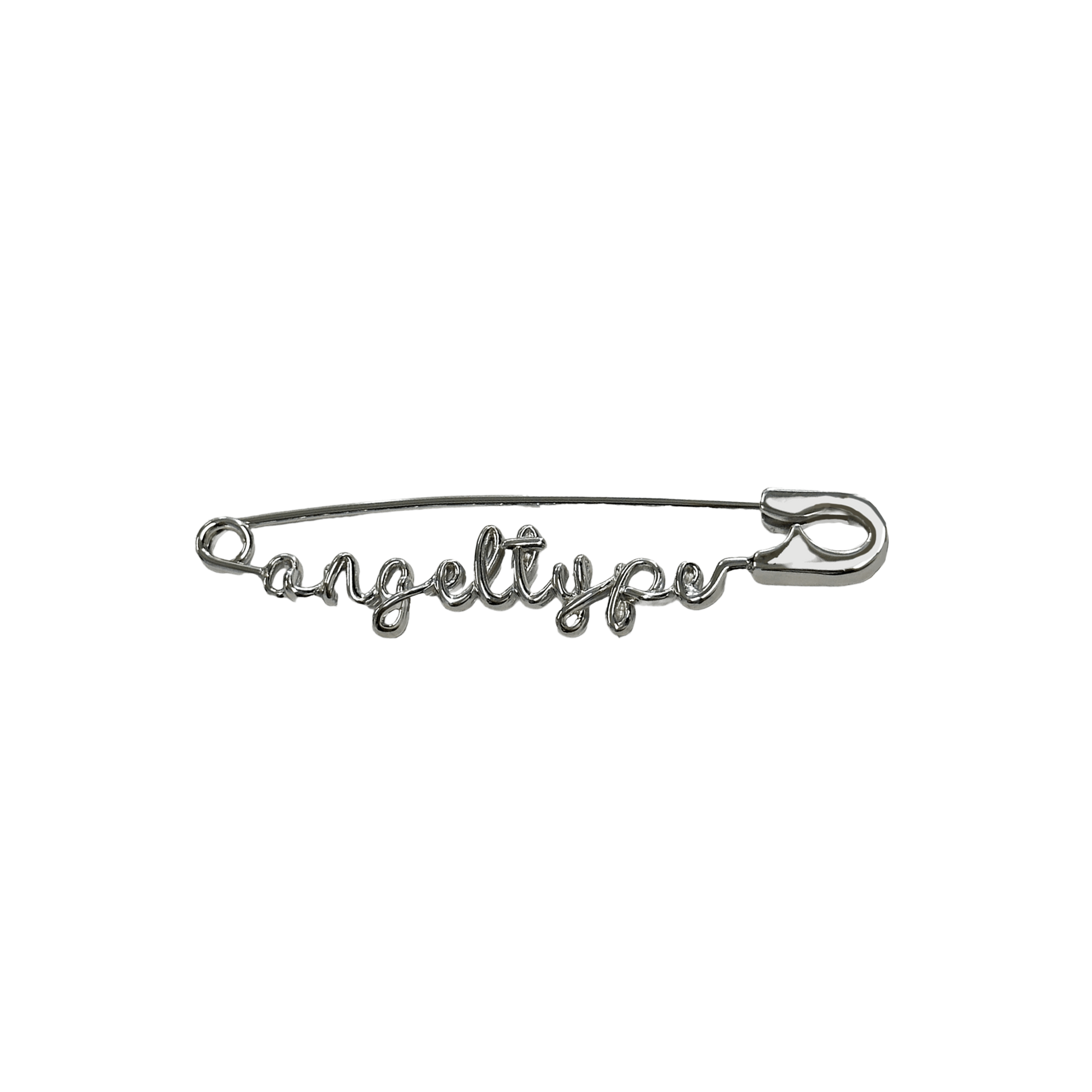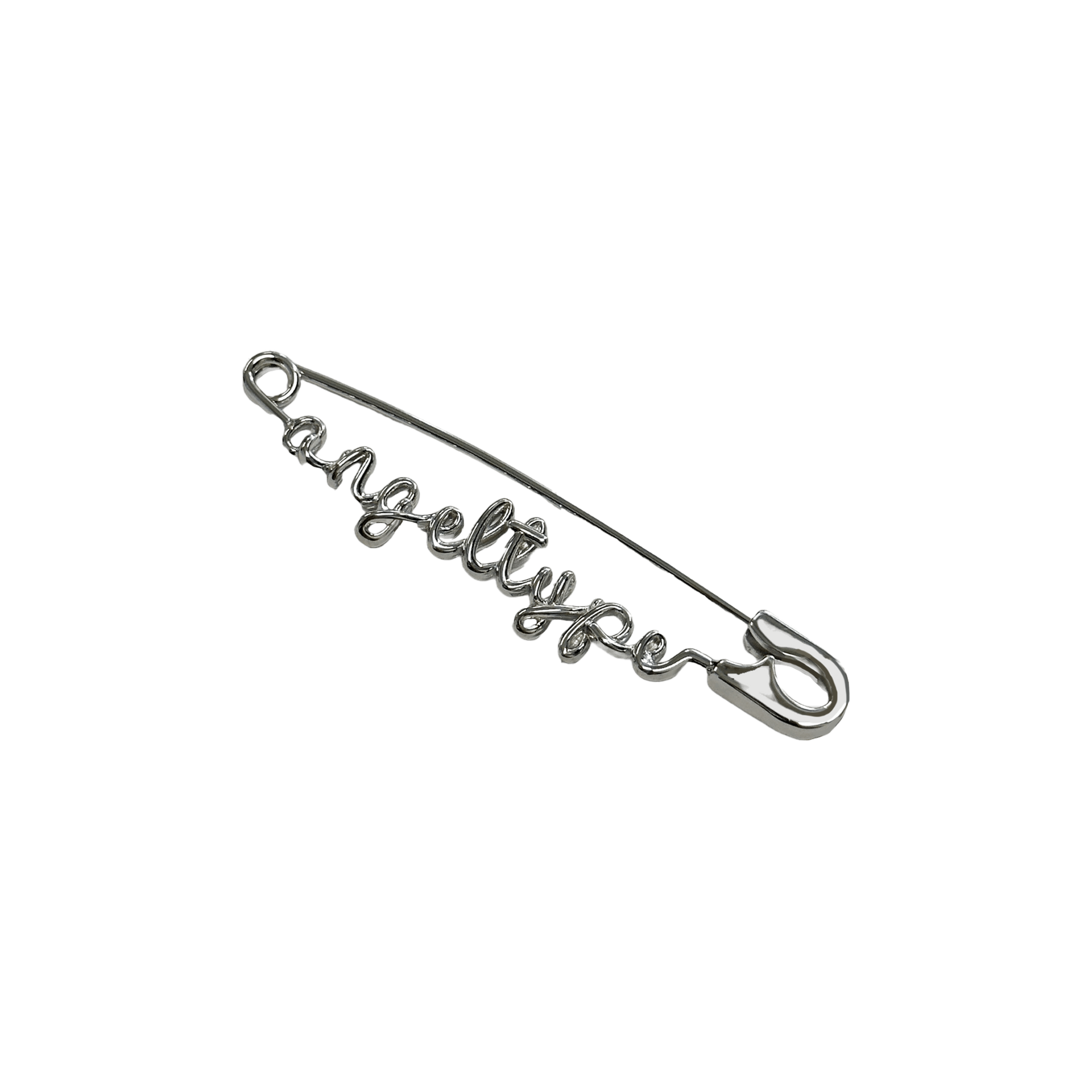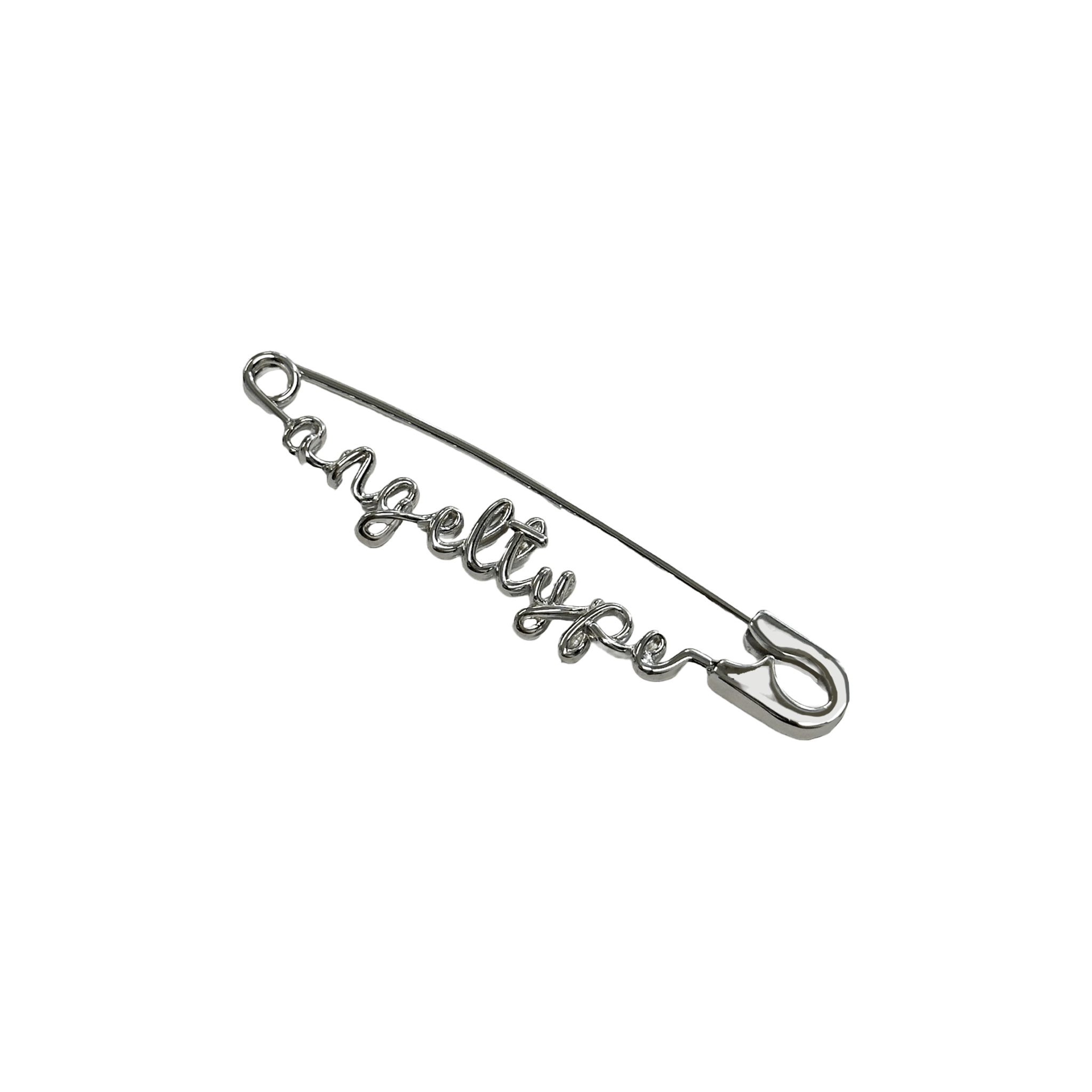 This safety pin is crafted from .925 sterling silver and features rhodium plating, which enhances the pin’s springiness and functionality. The design showcases the designers personal cursive script. This versatile accessory is perfect for securing clothing items such as ties, shirts, shoelaces, or even hair bows.