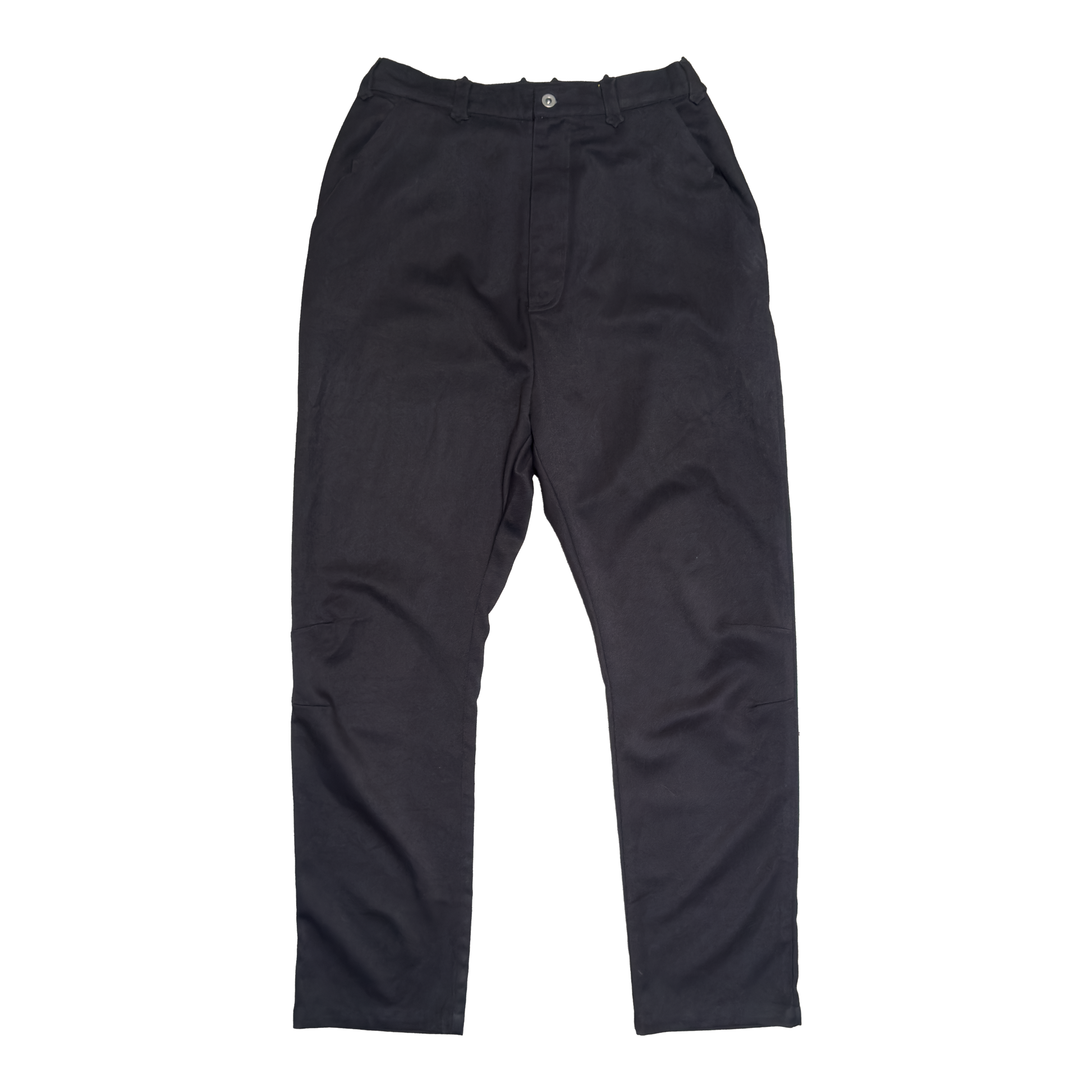 These were the final unreleased version of the Shield Pants. Pretty nice and sleek wool, crown belt loops and back pockets, darted knees, adjustable waist, dual shank buttons.