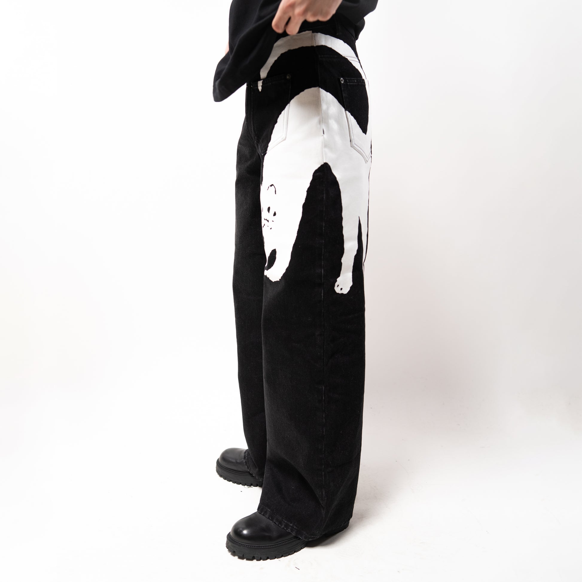 ✦ Features: Silkscreen printed cat pattern, brass YKK zipper, leather belt patch, 4 unconventional pockets, antique silver-tone hardware, light stonewash