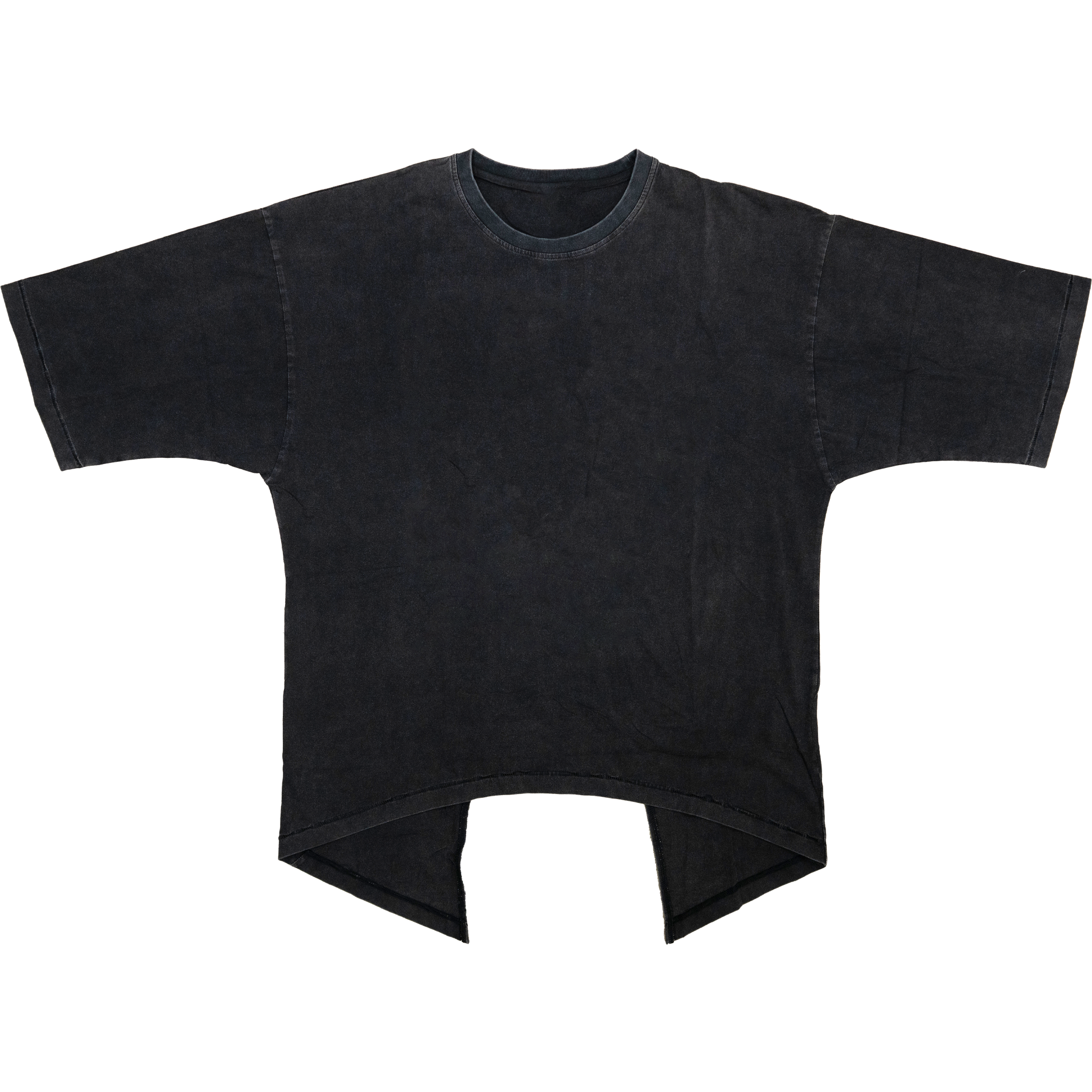 This silhouette draws inspiration from both traditional smock shapes and experimental avant-garde tailoring, reimagined in a minimalist tee form. It's constructed from a heavyweight washed black cotton jersey. Features include a dropped shoulder, wide body, and an extended split hem with a curved cut-out detail at the back for layering.