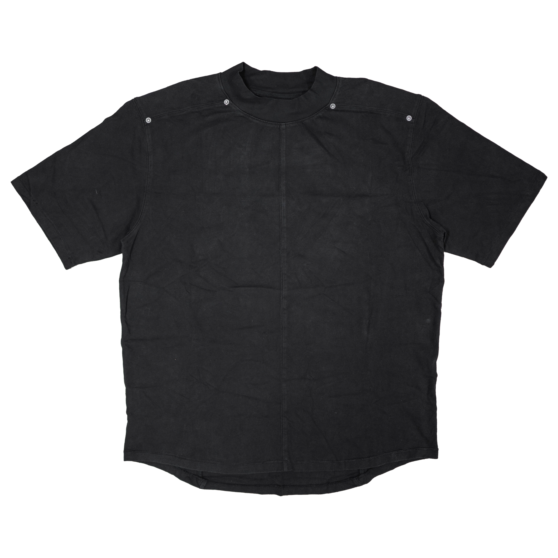 A structured washed black tee with a mock-neck collar and reinforced vertical seaming across the body. Rivets along the shoulders introduce a military-inspired edge, while the curved hem softens the shape.