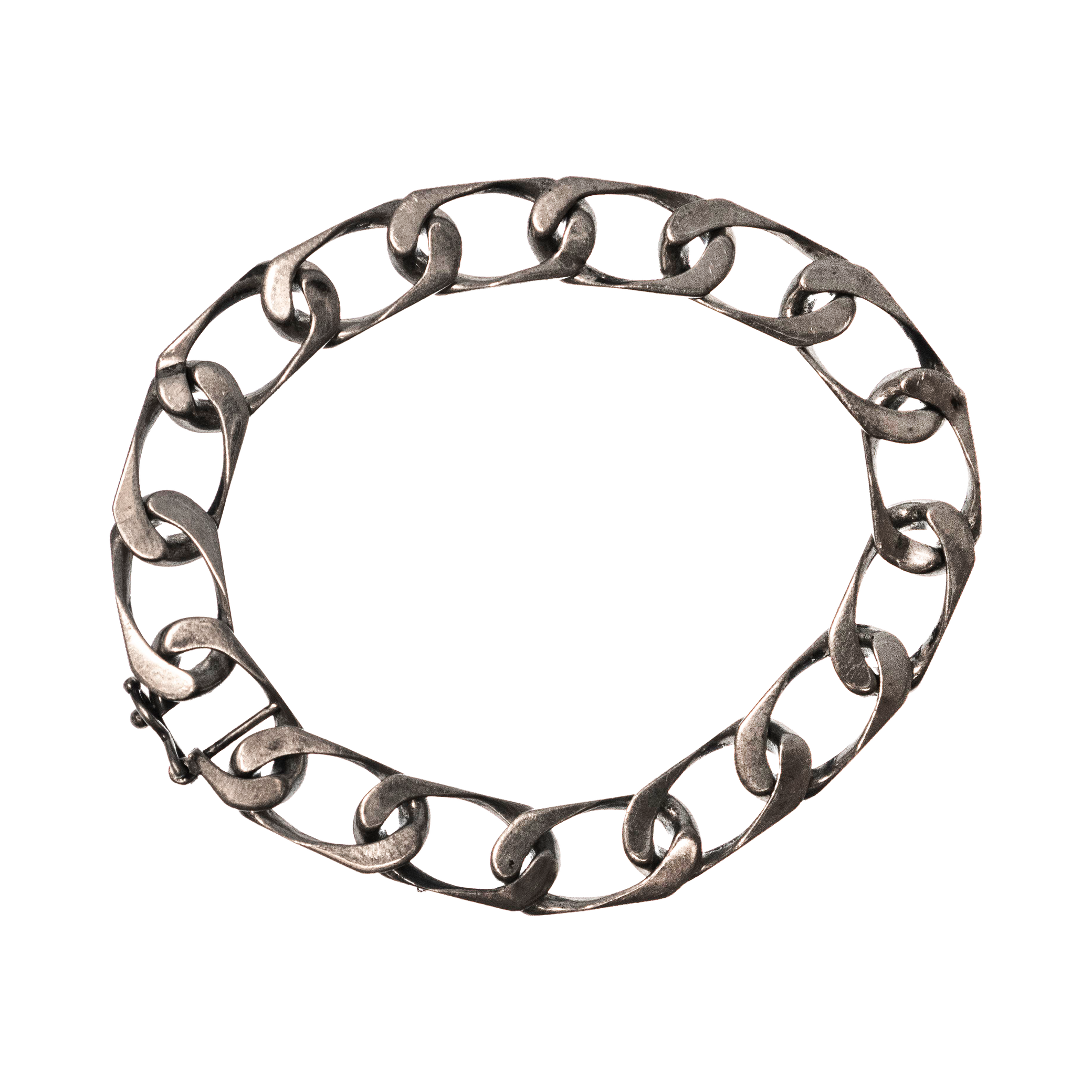 These links were custom cast to replicate a handmade bracelet owned by the designers late grandfather. The clasp utilizes a hook integrated into the chain, commonly seen on vintage handmade curb bracelets like the reference.