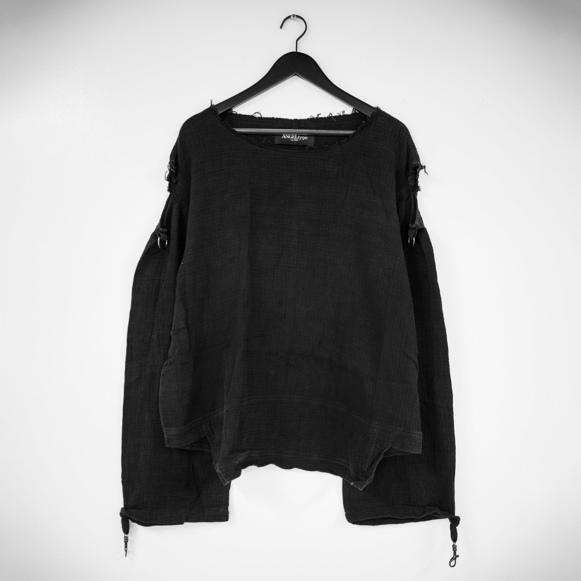 ✦ 特点:肩部镂空、毛边接缝、单针袖子和下摆、黑色金属五金环和夹子、重度做旧、轻度水洗技术、后中缝
