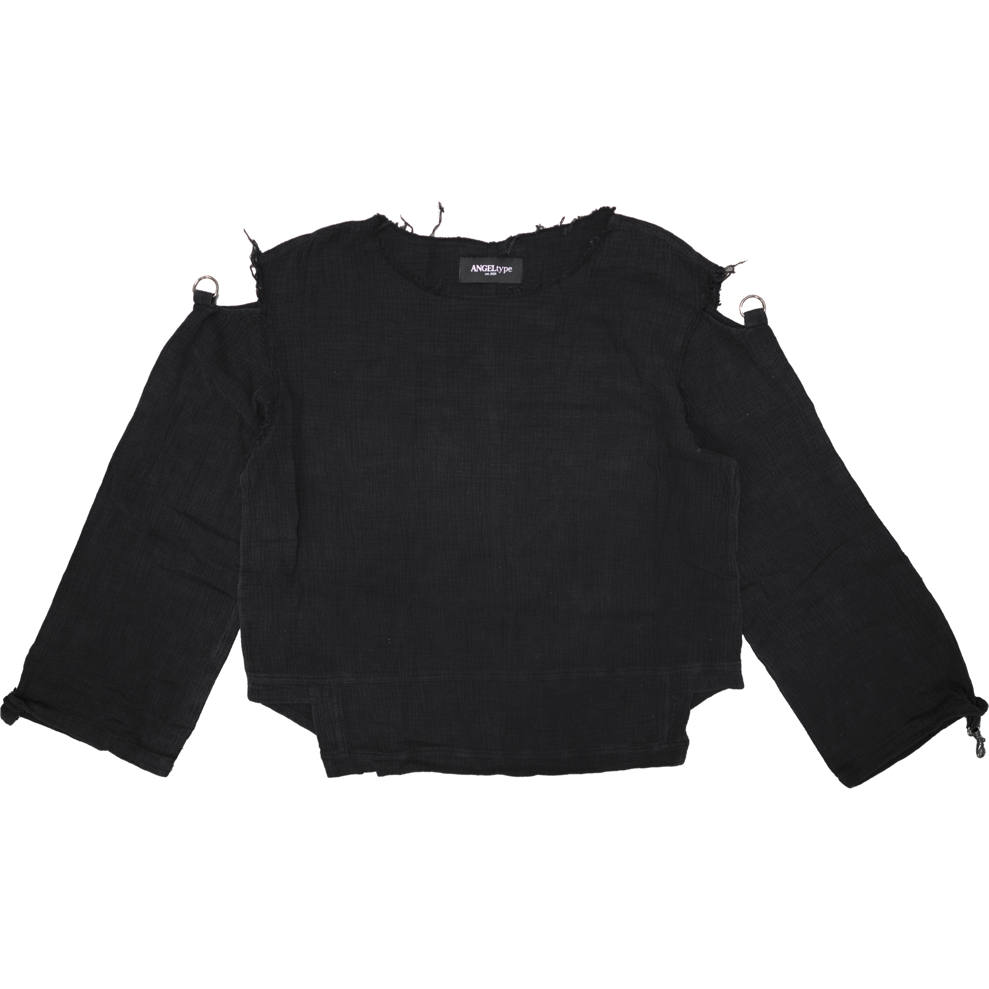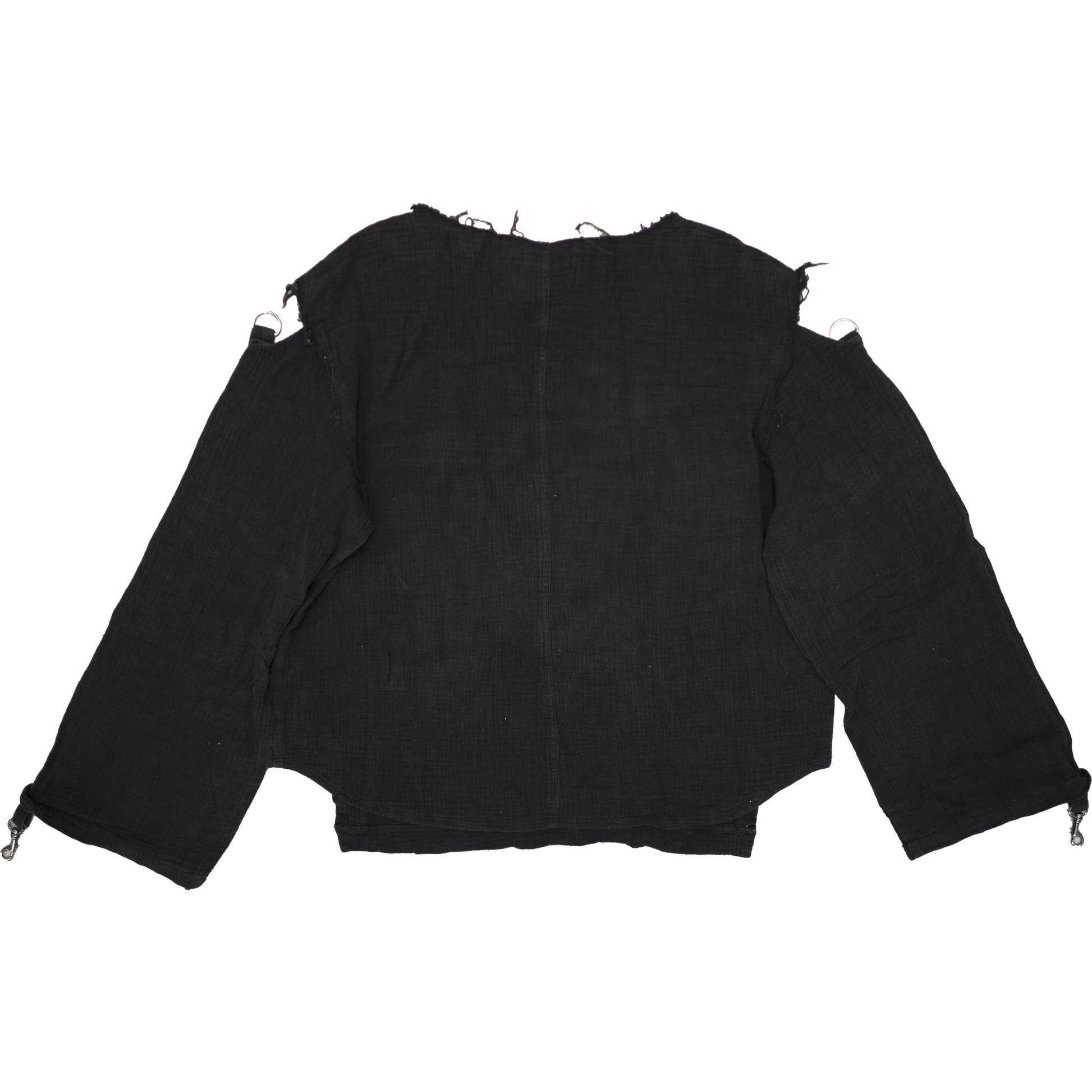 这款平纹细布长袖的第二代产品,尺寸和结构均经过改进。肩部镂空设计经过重新设计,结构更加优化。该款服装包含毛边接缝、黑色金属环和夹扣、后中缝线,以及下摆和袖口的单针缝线。面料经过轻度水洗和重度做旧处理。采用轻质100%纯棉平纹细布制成。