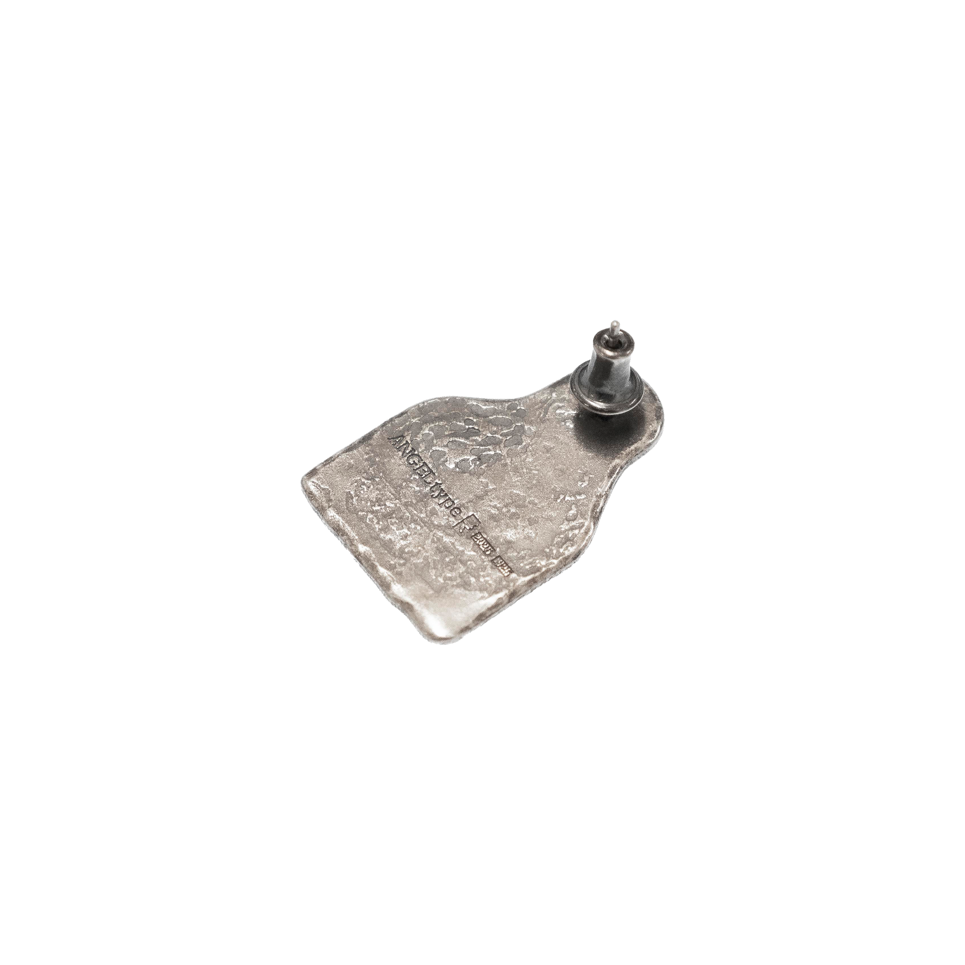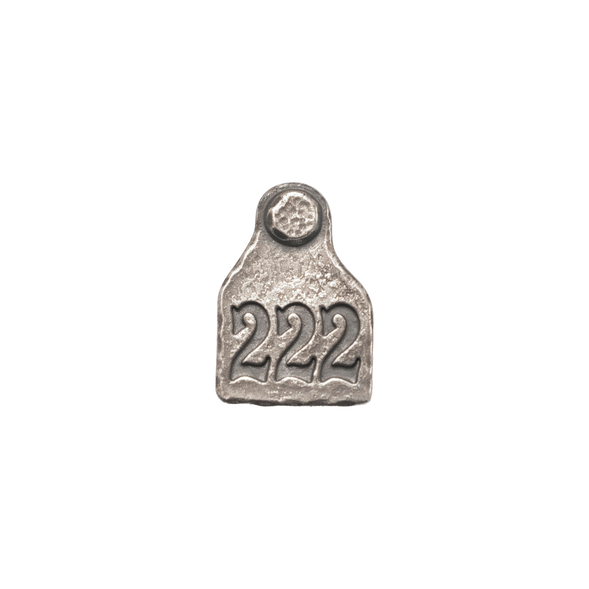 Forged in oxidized sterling silver, this earring reinterprets the utilitarian livestock tag as a sculptural ornament. The surface bears a distressed patina, with a hammered pin detail and engraved numerals 222. Worn edges and uneven texture emphasize imperfection, echoing both protest object and archival relic.