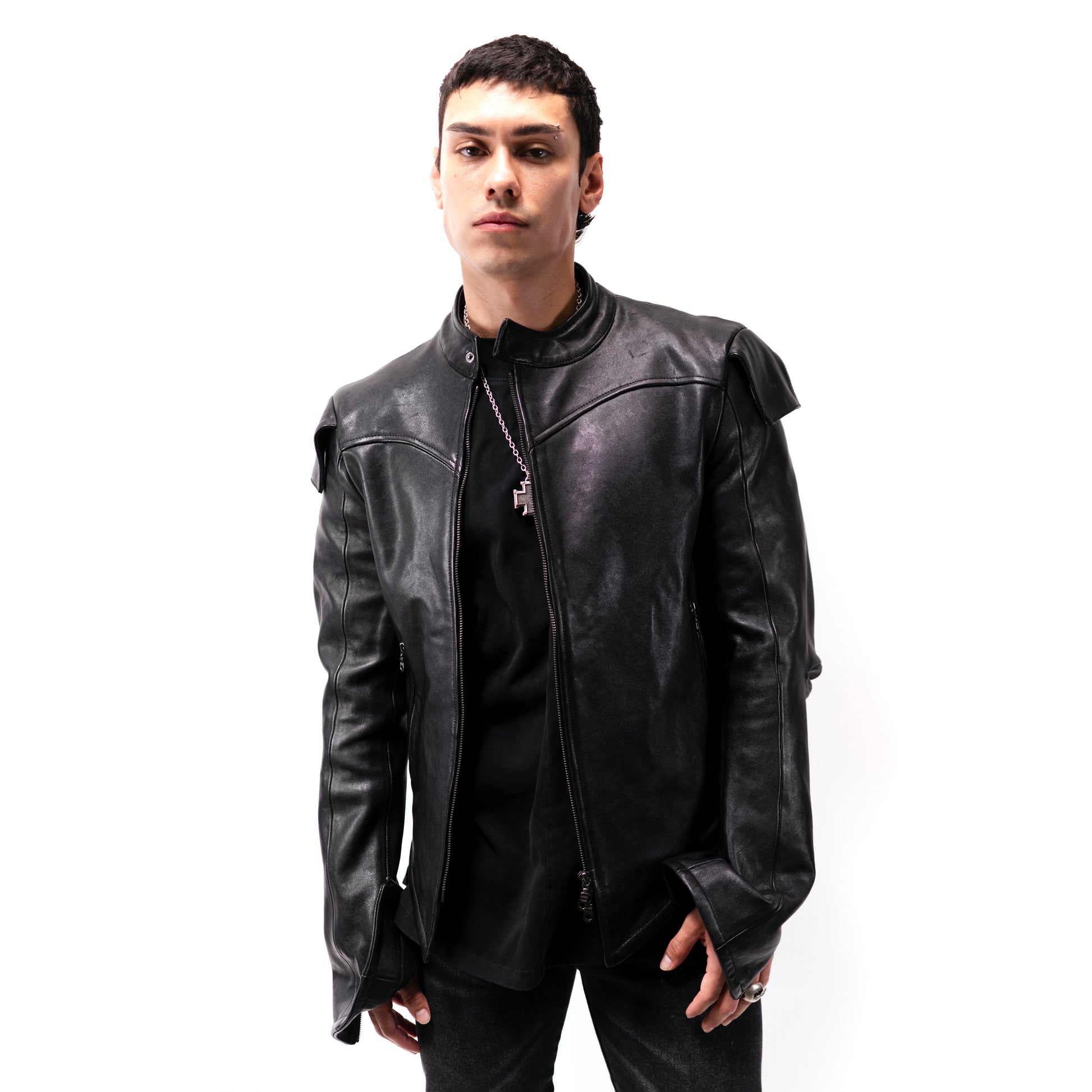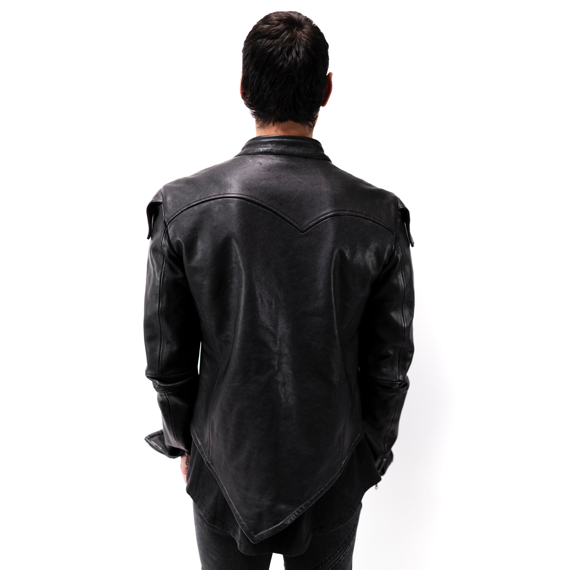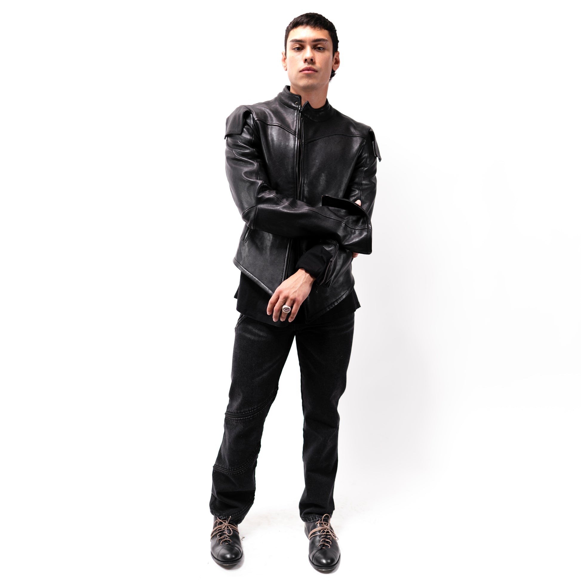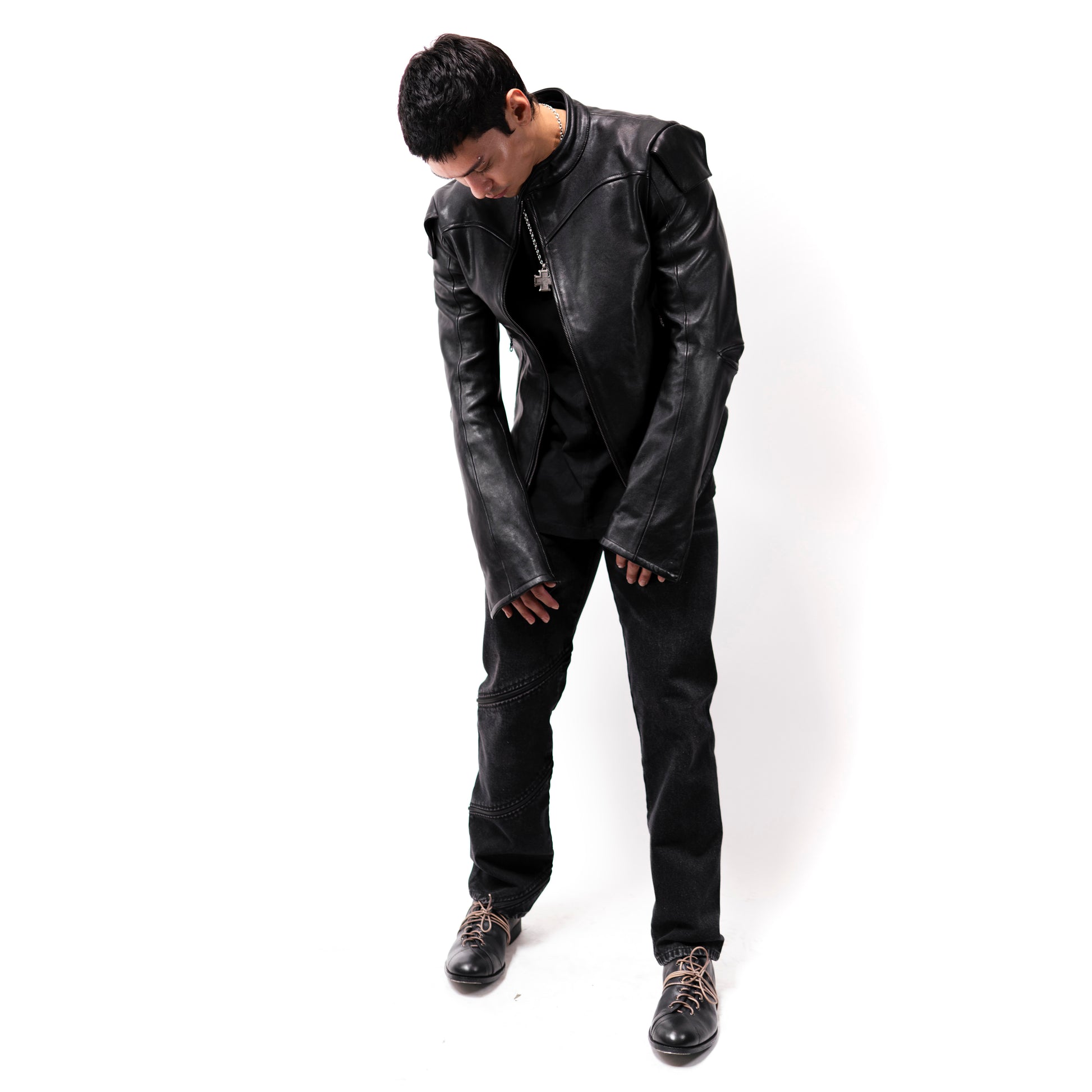 圣骑士夹克采用柔软的羊皮制成,内衬精致亚麻。其设计注重结构感和内敛感,廓形融合了现代剪裁和中世纪的防护设计。加固的肩部护翼借鉴了装甲板的设计,而铰接式肘部和加长袖子则增强了运动感。不对称的下摆和修身的棱角分明的衣身,营造出向腰部收窄的锐利廓形。
