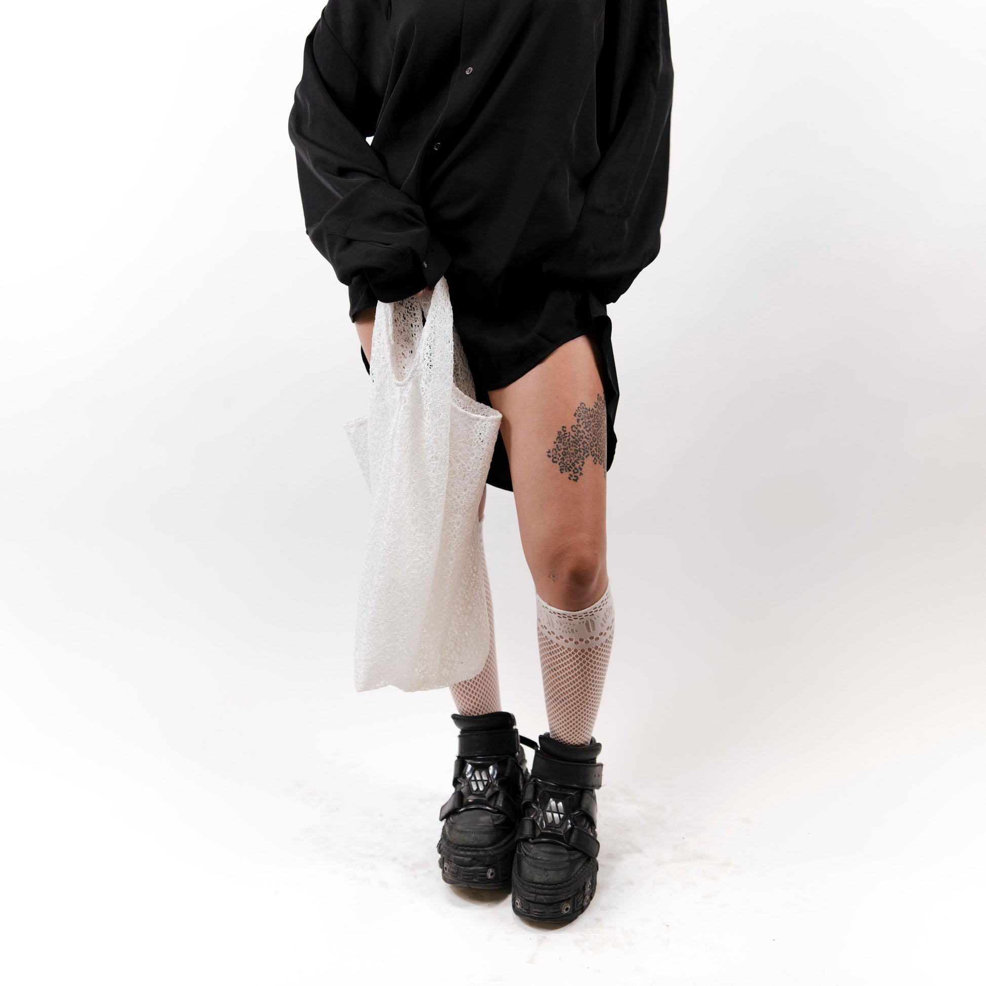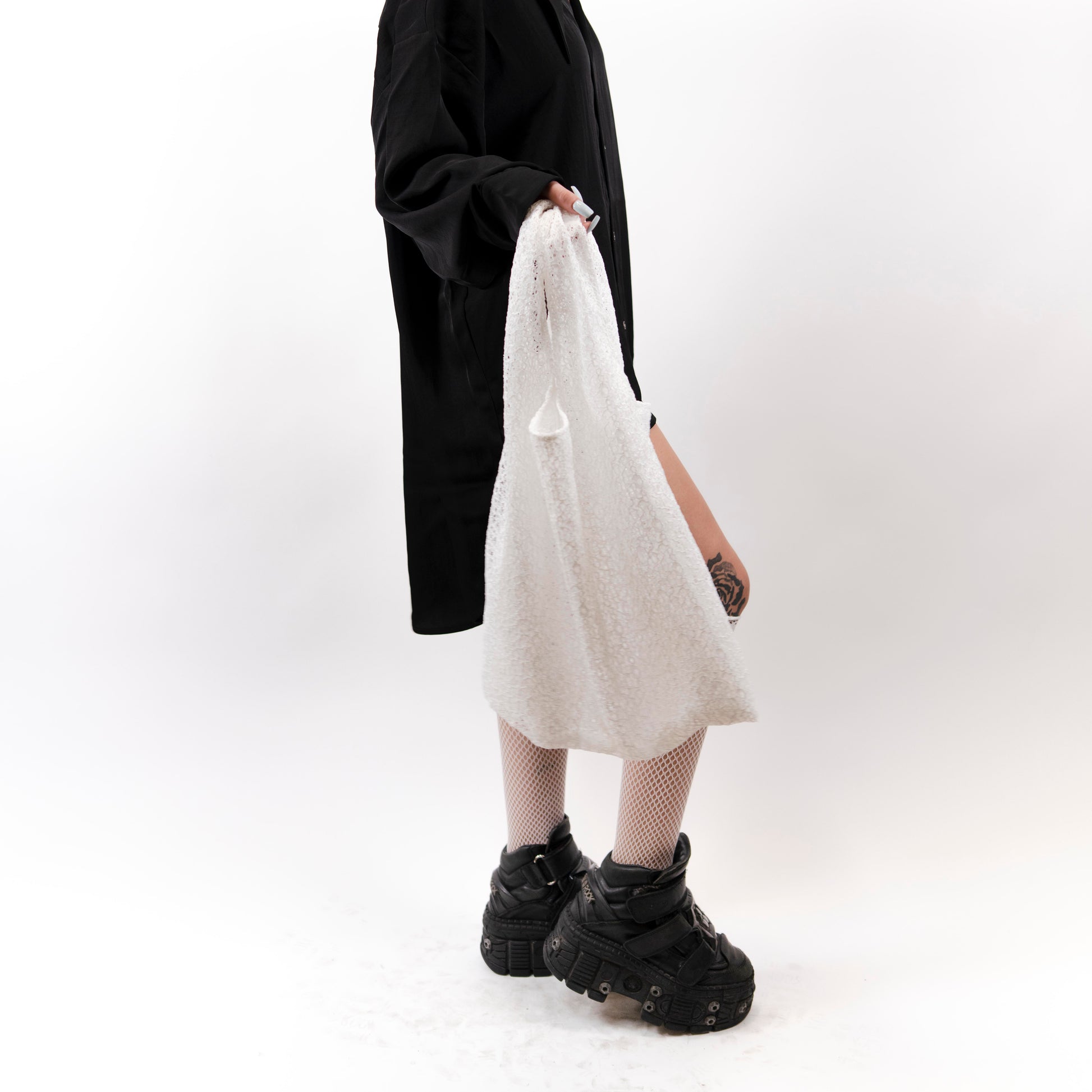 Constructed from layered white lace, its semi-sheer body draws on medieval textile traditions where lacework was used as both adornment and veil. The bag’s squared silhouette is softened by the irregular texture of the lace. Designed for everyday use with a sense of fragility, the piece balances delicacy with utility, echoing Gothic tracery in architecture where fine detail reinforced structure.